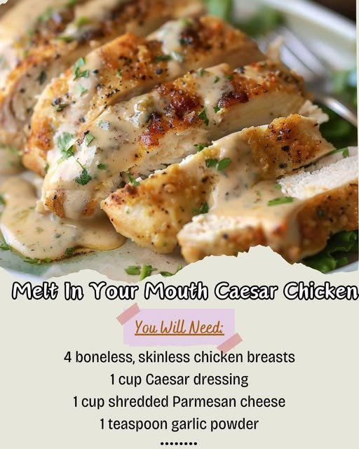 Here’s a simple and flavorful Caesar Chicken 🍗🥗 — juicy chicken baked in creamy Caesar dressing with Parmesan and herbs: