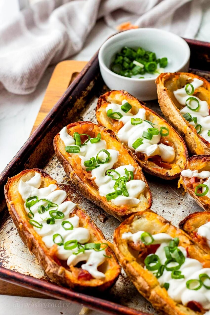 ✔ Make ahead: Bake and crisp skins, then refrigerate. Reheat and add toppings before serving.