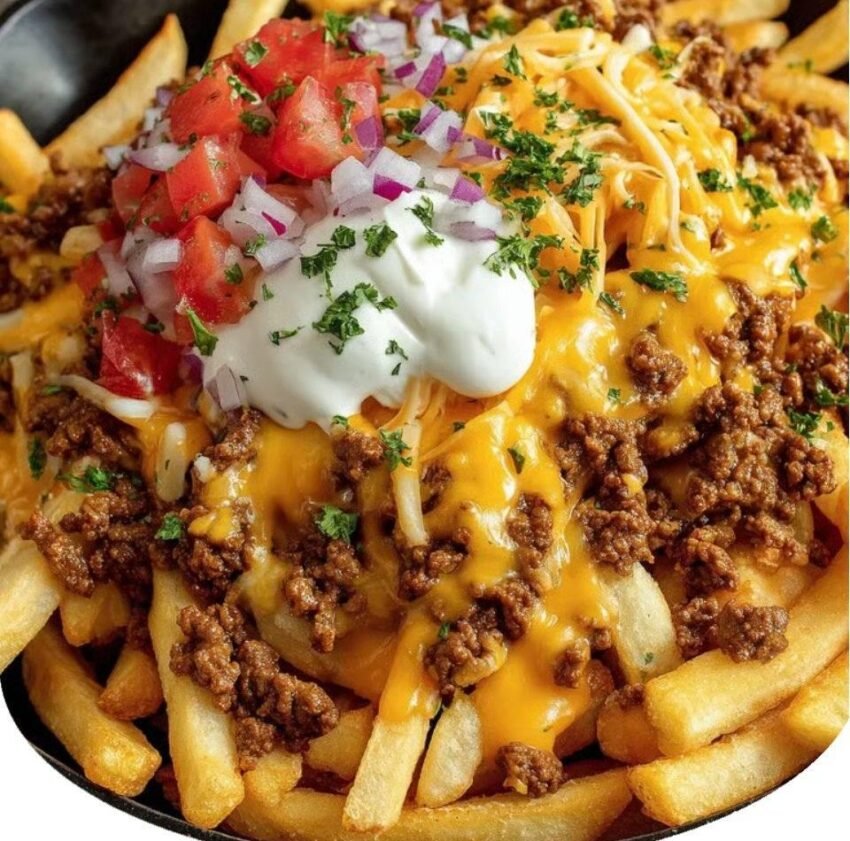 Crispy golden fries smothered in savory beef, melted cheese, and all your favorite toppings—the ultimate game-day snack or indulgent meal!